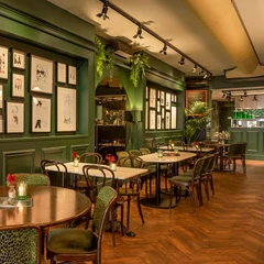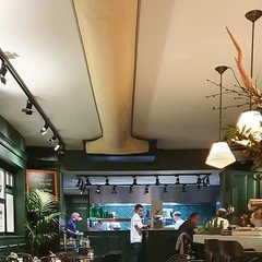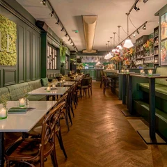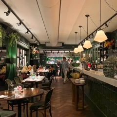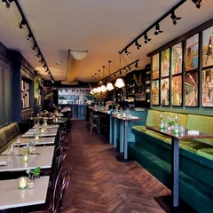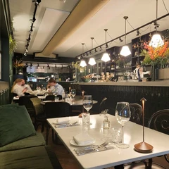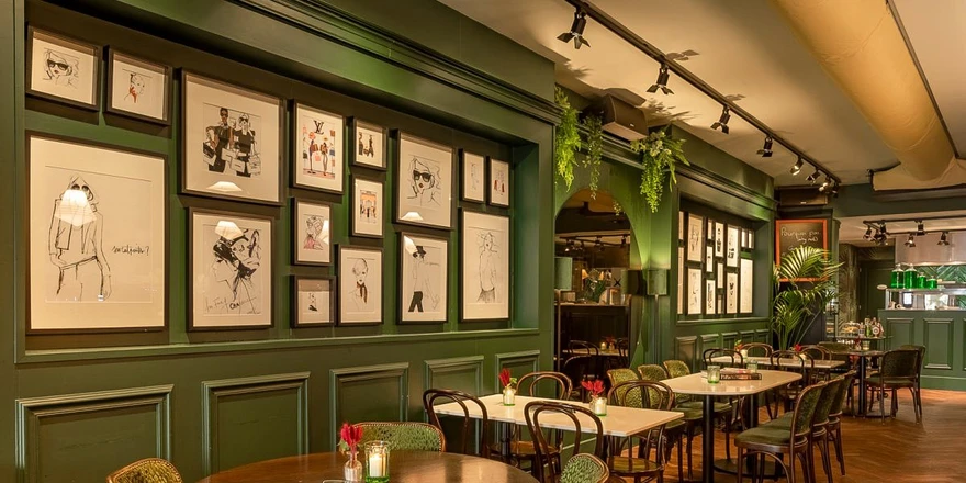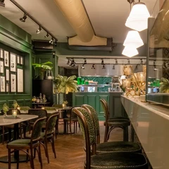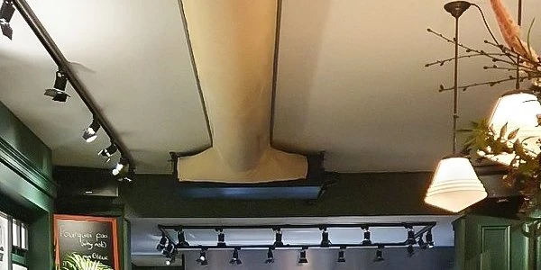 A half round Euro Air textile diffuser with a length of 13.7 m, made of TCS material with a permeability of 325 m³/m²/h in light grey (RAL 9002), is suspended on rails mounted directly to the ceiling and connected using a TextuFrame connection frame. The air is evenly distributed into the entire space without drafts and without odors coming from the kitchen, guests can enjoy their meals undisturbed in a pleasant and fresh indoor climate, without the air-handling system interfering with the atmosphere of the bistro.