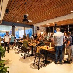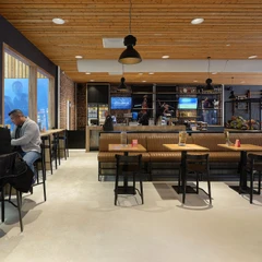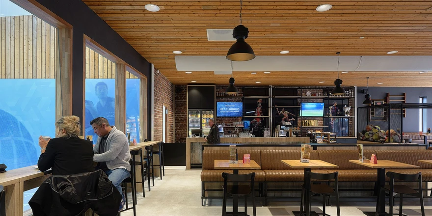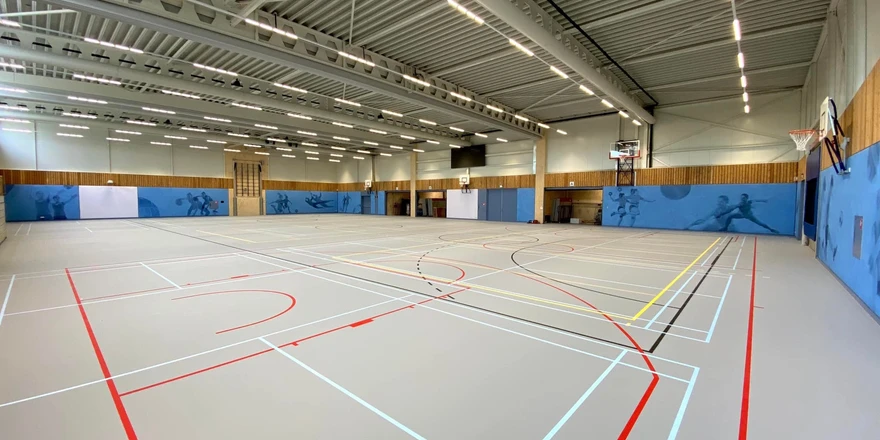 In the restaurant area, half-round ducts made of TCS material in light grey (RAL 9002) with DFC perforation in the Induction variant are installed and suspended on rails. In the gymnasium, round ducts made of the same-colored DFC-HT material are used, also with DFC perforation in the Induction variant. In both spaces, the system ensures even air distribution along the entire duct length, without drafts or dead zones.