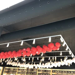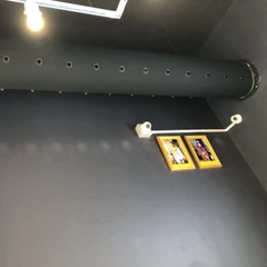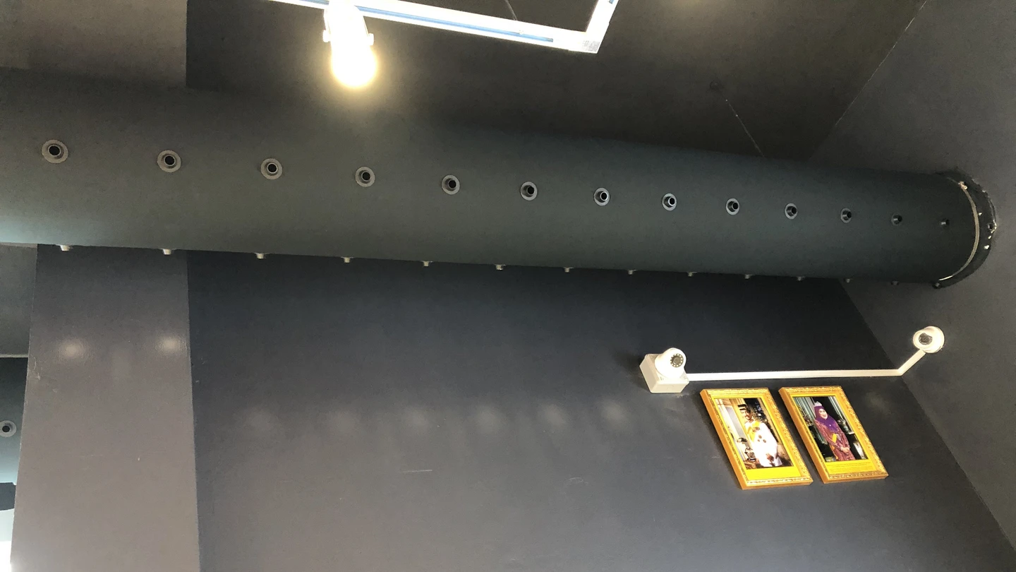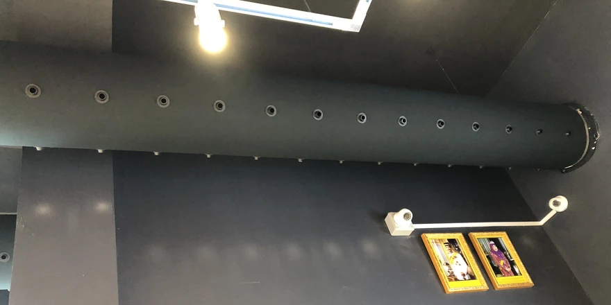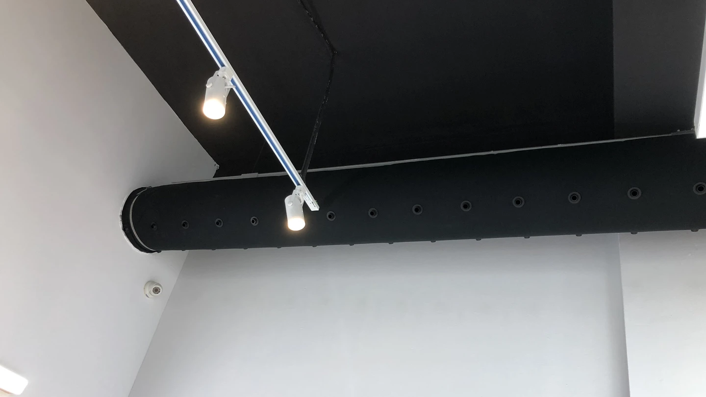 The space is equipped with black textile ducts, suspended on aluminum profiles that provide secure mounting and clean routing of the distribution system. For air distribution, black plastic nozzles (RAL 9005) were used, enabling targeted airflow exactly where it is needed, an ideal solution for areas with higher heat loads from displayed electronics. The connection to the circular air supply is achieved using Motex tape, attached to a sewn-in cord at the beginning of the diffuser, allowing for quick installation and easy maintenance.