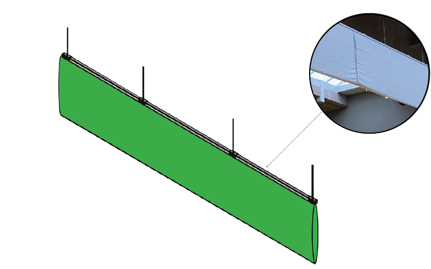 Nejlepšího efektu je dosaženo při instalaci na jednu řadu do hliníkového profilu, kde textilní potrubí drží pevnou linii a vypadá elegantně i mimo provoz.